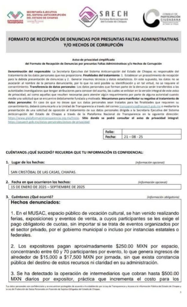 Ciudadanos y colectivos culturales denunciaron que el Museo de San Cristóbal de Las Casas (MUSAC), recinto de vocación cultural, se ha utilizado de manera recurrente para ferias, exposiciones y actividades de carácter comercial, lo que, aseguran, desvirtúa su misión y carece de mecanismos claros de transparencia.
