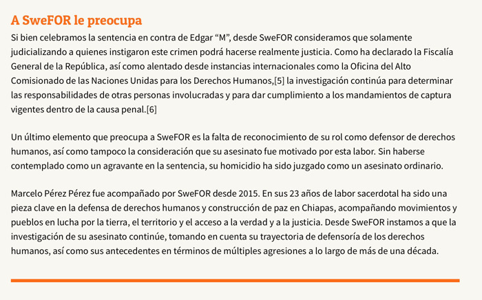 El Movimiento Sueco por la Reconciliación (SweFOR) advirtió que la condena contra Edgar “M” por homicidio calificado, dictada en agosto, no puede considerarse suficiente, pues no aborda la participación de otros responsables ni reconoce que el asesinato estuvo relacionado con la labor del sacerdote en la defensa de los derechos humanos.