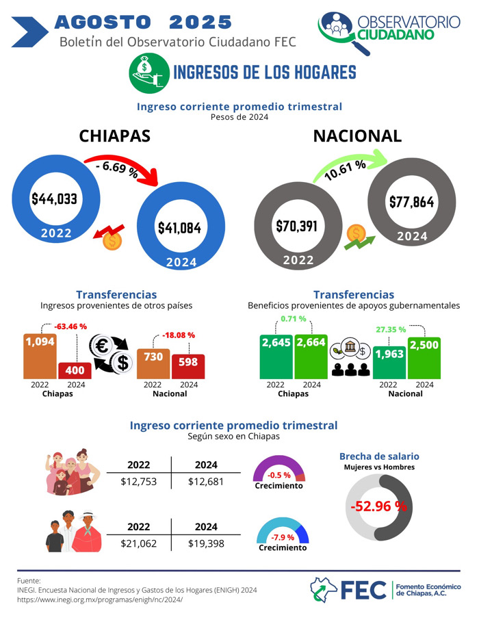 El Observatorio Ciudadano FEC señaló que estas cifras reflejan los retos persistentes en materia de ingresos y desigualdad en Chiapas frente al escenario nacional.