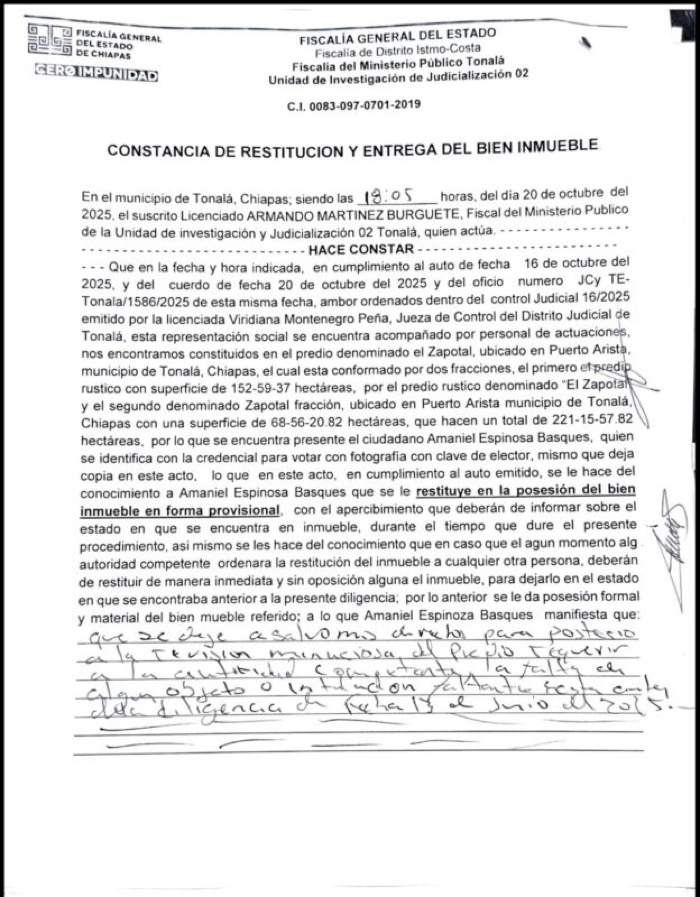 Habitantes de comunidades rurales en Tonalá señalaron que, pese a contar con resoluciones judiciales de la Fiscalía General del Estado, que les reconocen la posesión de terrenos en la zona costera, enfrentan un entorno de presión e intimidación que no ha cesado.
