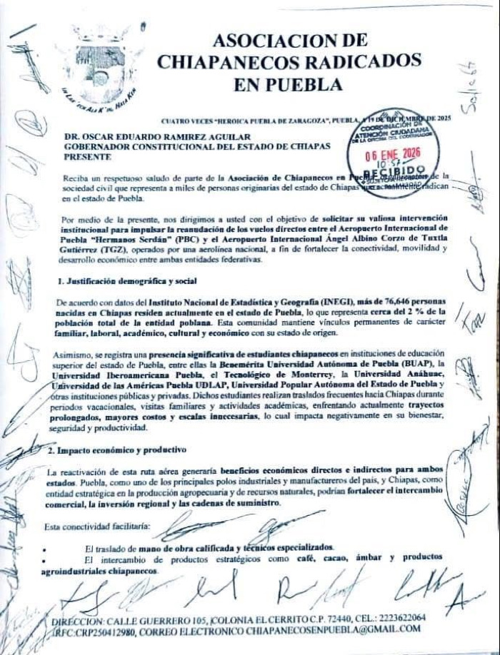La petición fue presentada por la Asociación de Chiapanecos Radicados en Puebla, organización de la sociedad civil que representa a miles de personas originarias de Chiapas que viven en esa entidad. En un documento fechado el 6 de enero de 2026 y dirigido al gobernador constitucional de Chiapas, Eduardo Ramírez Aguilar, la asociación expuso la relevancia social y económica de reanudar esta ruta aérea mediante una aerolínea nacional.