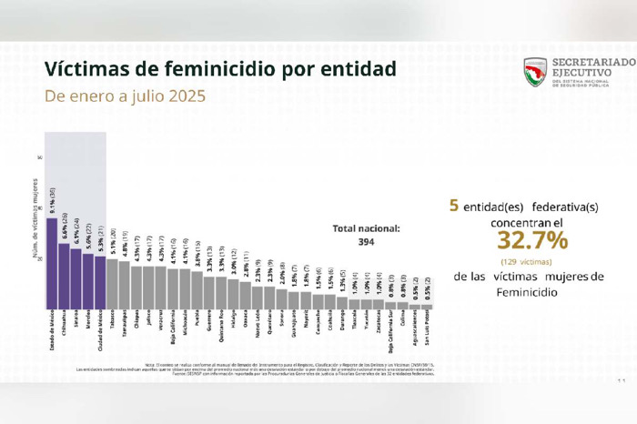 De enero a julio de 2025, México registró 394 feminicidios, según el Secretariado Ejecutivo del Sistema Nacional de Seguridad Pública (SESNSP). La concentración más alta se ubicó en el Estado de México, Chihuahua, Sinaloa, Morelos y Ciudad de México, que sumaron 129 casos, equivalentes al 32.7 por ciento del total nacional. En el caso de Chiapas, el SESNSP reportó 17 feminicidios, es decir, el 4.3 por ciento del total. Sin embargo, las cifras oficiales contrastan con los registros de organizaciones civiles: mientras la Fiscalía estatal reconocía 11 feminicidios hasta mayo, colectivos documentaron al menos 22 víctimas en el mismo periodo.