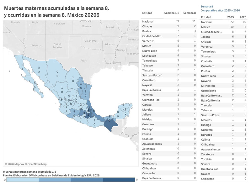 A nivel nacional, el reporte preliminar señala 69 defunciones maternas al corte del 2 de marzo de 2026, tres más que en el mismo periodo de 2025, cuando se contabilizaron 66. La Razón de Mortalidad Materna se ubicó en 22.5 por cada 100 mil recién nacidos vivos estimados, lo que representa un incremento de 5.8 por ciento respecto al año anterior.