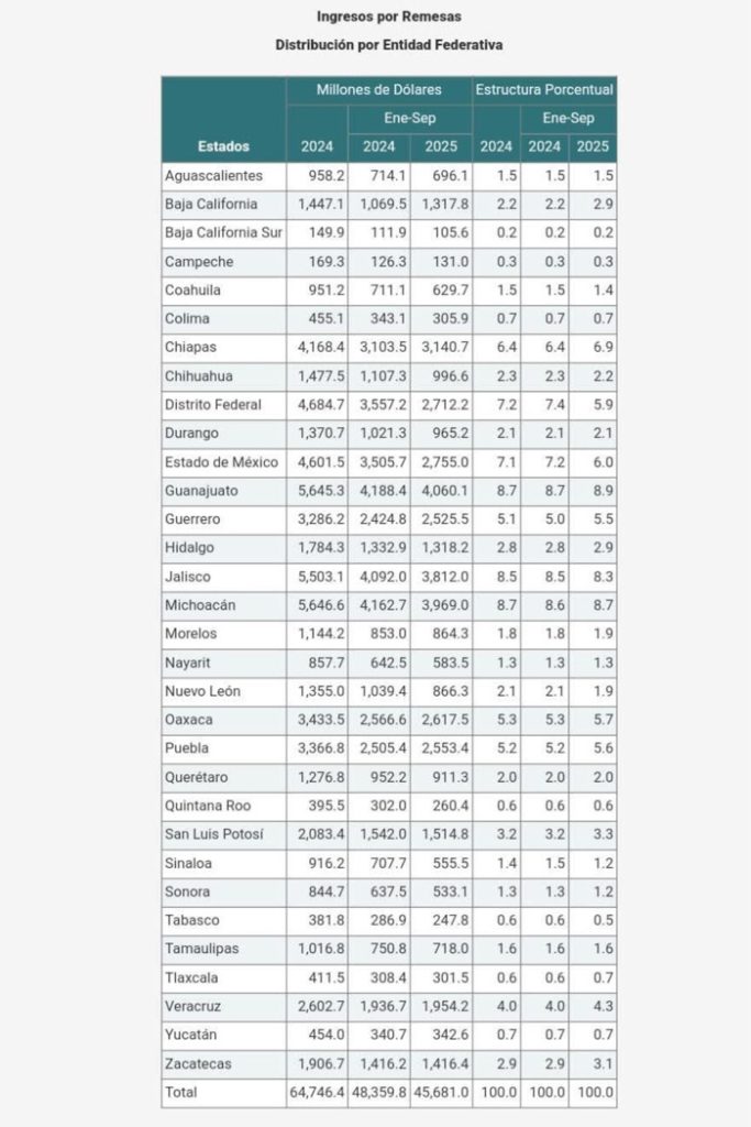 El monto consolidó a Chiapas como el sexto estado del país con mayor captación, concentrando 6.9 por ciento del total nacional. A nivel general, México recibió 45 mil 681 millones de dólares en remesas durante ese lapso, cifra 5.5 por ciento menor en comparación con 2024.
