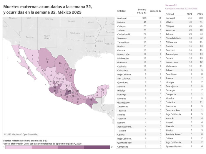 Chiapas se mantiene entre las entidades con mayor número de muertes maternas en el país, de acuerdo con el informe de la Dirección General de Epidemiología de la Secretaría de Salud correspondiente a la semana 32 de 2025.