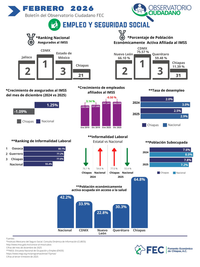 El nivel de informalidad contrasta con los indicadores de afiliación a la seguridad social. Chiapas ocupó el lugar 21 en el ranking nacional de trabajadores asegurados al Instituto Mexicano del Seguro Social (IMSS) y el sitio 31 en cuanto al porcentaje de población económicamente activa afiliada, con apenas 11.39 por ciento, el valor más bajo entre las entidades federativas.