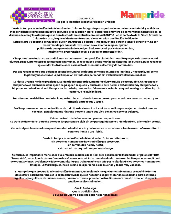 Finalmente, recordó que entre sus actividades se encuentra la organización de la Marcha del Orgullo LGBTTTIQ+ “Mampride”, una movilización impulsada por organizaciones y activistas que buscan visibilizar y defender los derechos humanos de la diversidad sexual en Chiapas.