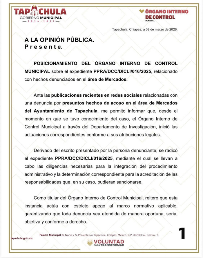 Tras la difusión pública de la denuncia, el Órgano Interno de Control del ayuntamiento informó que existe un expediente administrativo abierto relacionado con presuntos hechos de acoso en el área de Mercados. Según el comunicado emitido por el titular del organismo, José Alfredo Jiménez Reyes, el procedimiento identificado como PPRA/DCC/DICLI/016/2025 se encuentra en proceso de integración.