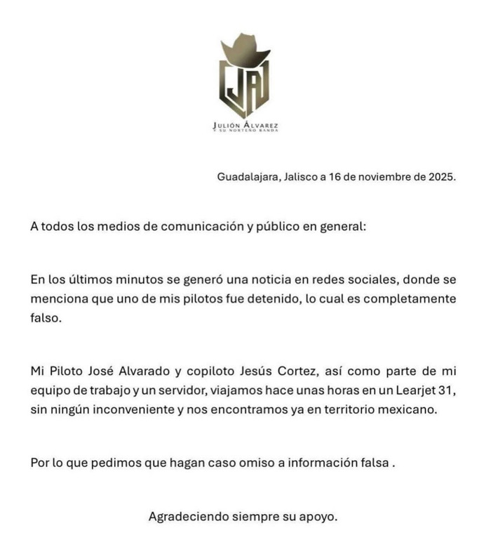 Tras la publicación de la noticia, Julión Álvarez negó tajantemente cualquier vínculo laboral con el detenido. En un mensaje difundido en redes sociales, aseguró que tanto él como su piloto y copiloto viajaron horas antes en un Learjet treinta y uno hacia México sin contratiempos, y que el hombre capturado no forma parte de su equipo de trabajo. El cantante pidió omitir información falsa y agradeció la preocupación de sus seguidores.