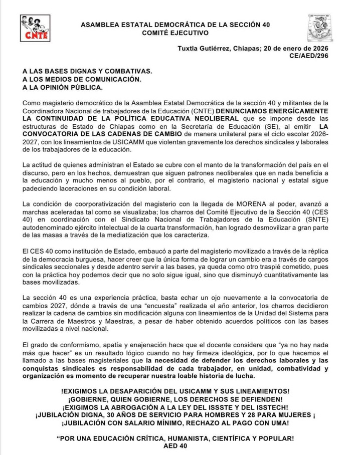 La convocatoria de cadenas de cambio para el ciclo escolar 2026-2027, emitida por la Secretaría de Educación en Chiapas, generó inconformidad entre integrantes de la Asamblea Estatal Democrática (AED) de la Sección 40 del magisterio, quienes señalaron que el proceso se realizó sin consulta amplia y mantiene criterios previamente cuestionados por el sector docente.