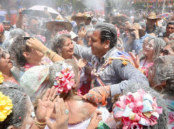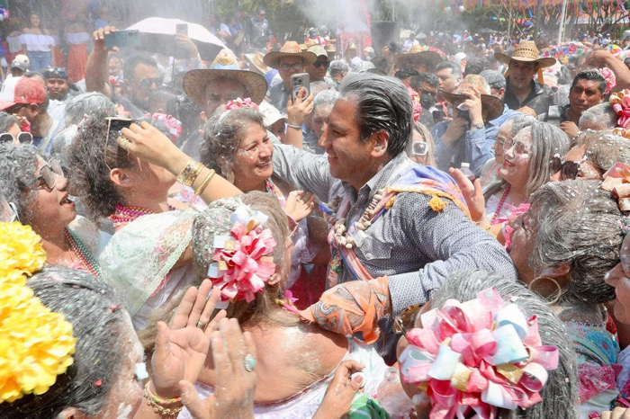 La algarabía es total: vestidos con sus trajes coloridos y llenos de historia, desfilan personajes que representan rostros humanos o animales, combinando máscaras, listones y accesorios; mientras las coitequitas y correlonas invitan a la gente a sumarse al carnaval, regalando dulces, sonrisas y “curaditos”. El mandatario no solo presenció la fiesta, sino que vivió su esencia: bailó, gritó y participó en la “guerra de talco y harina”, que representa la purificación del alma y la bienvenida al carnaval.