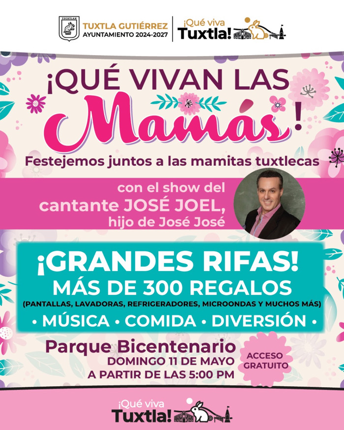 En el marco del Día de las Madres, el Ayuntamiento de Tuxtla Gutiérrez, a cargo del alcalde Angel Torres, invita a que festejemos juntas y juntos a las mamitas tuxtlecas, este domingo 11 de mayo en el Parque Bicentenario a partir de las 5 de la tarde.