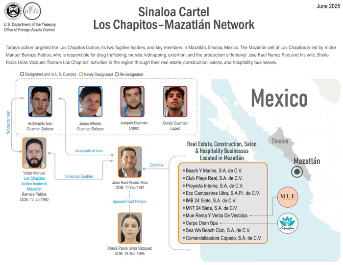 El Departamento del Tesoro de Estados Unidos sancionó a una red empresarial asentada en Mazatlán, Sinaloa, acusada de lavar dinero para el grupo criminal conocido como Los Chapitos. La lista incluye a diez empresas vinculadas a José Raúl Núñez Ríos y Sheila Paola Urías Vásquez, un matrimonio que había ganado notoriedad local por su éxito en negocios inmobiliarios, hosteleros y de belleza.