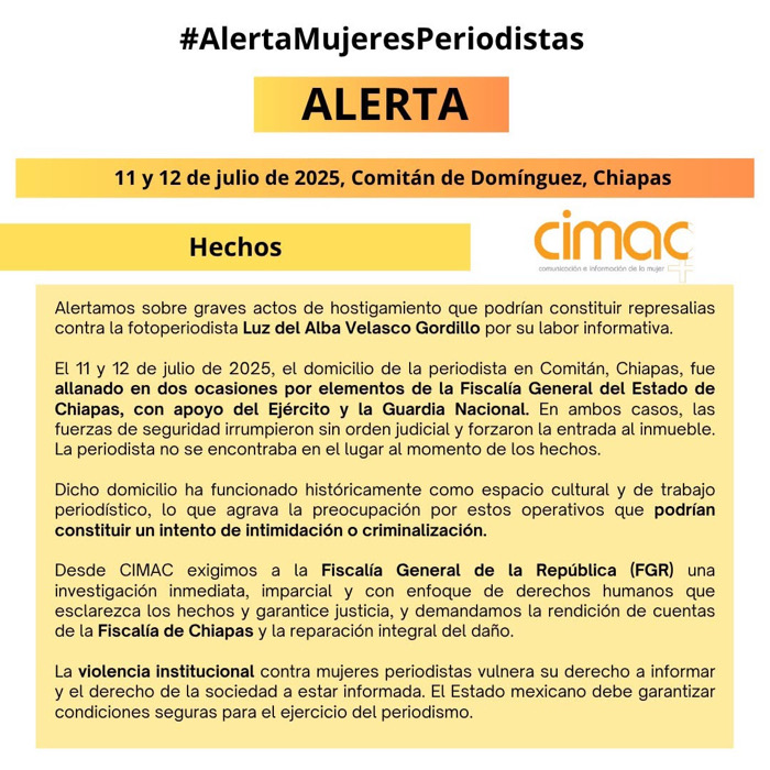 La asociación Comunicación e Información de la Mujer A.C. (CIMAC) difundió un pronunciamiento en el que exige a la Fiscalía General de la República una investigación inmediata, imparcial y con enfoque de derechos humanos. Además, pidió que la Fiscalía de Chiapas rinda cuentas por los operativos realizados los días 11 y 12 de julio, sin orden judicial y con presencia del Ejército y la Guardia Nacional.