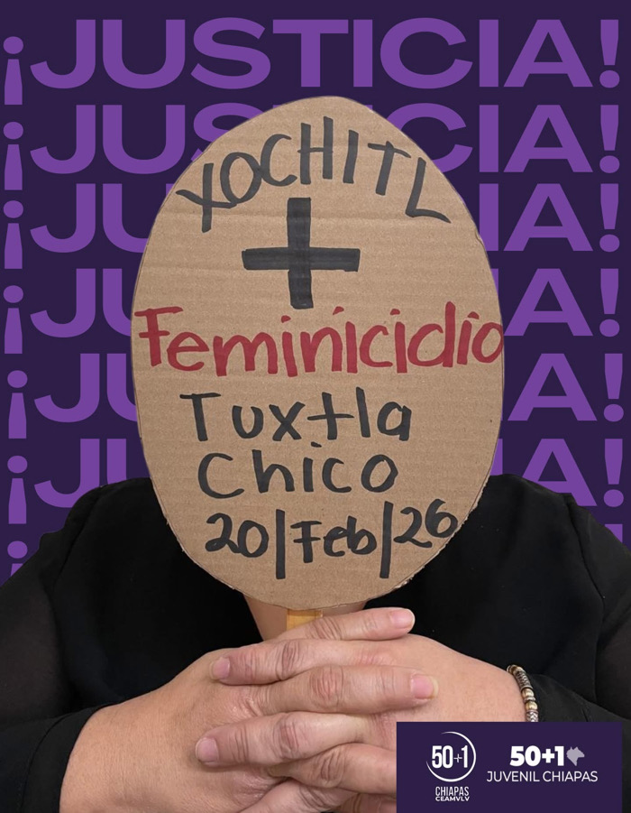 La organización informó que, con este caso, suman seis feminicidios en lo que va de 2026 en Chiapas y pidió a la Fiscalía General del Estado de Chiapas realizar una investigación pronta y con perspectiva de género, además de revisar el funcionamiento de la Alerta de Violencia de Género en la entidad.