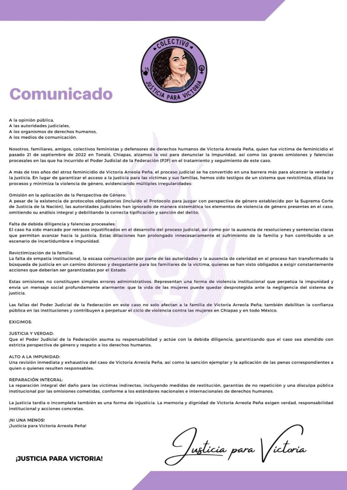 Familiares, amistades y colectivos feministas denunciaron presuntas irregularidades en el proceso judicial por el feminicidio de Victoria Arreola Peña, ocurrido el 21 de septiembre de 2022 en Tonalá, y exigieron al Poder Judicial de la Federación actuar con debida diligencia y perspectiva de género. El pronunciamiento fue emitido tras un nuevo feminicidio en el municipio de Tuxtla Chico.