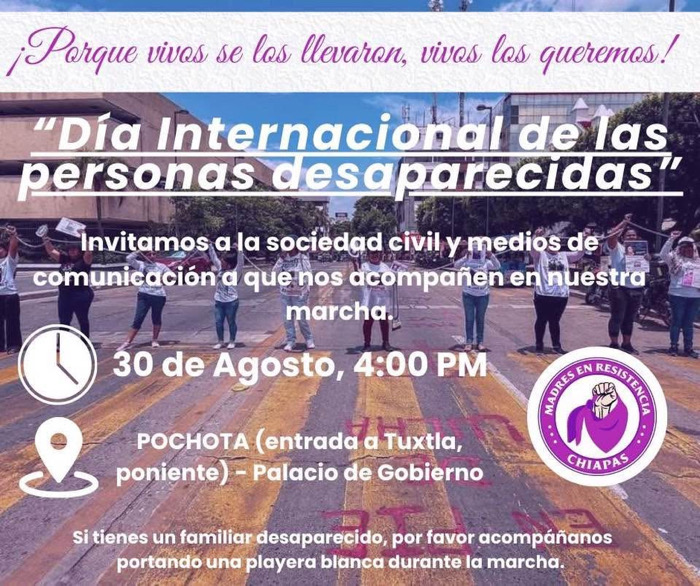 En el marco del Día Internacional de las Personas Desaparecidas, el colectivo Madres en Resistencia convocó a una marcha este viernes 30 de agosto a las 16:00 horas, que partirá de La Pochota y concluirá frente al Palacio de Gobierno.