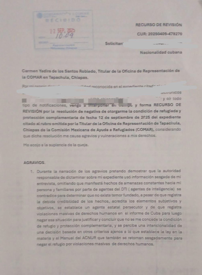 De acuerdo con el recurso, la negativa fue notificada el 12 de septiembre de 2025 y se emitió fuera del plazo legal de 90 días hábiles. La mujer aseguró que su caso estuvo marcado por retrasos en la programación de entrevistas de elegibilidad y que la autoridad utilizó información sesgada de su testimonio, omitiendo hechos de amenazas y hostigamiento en Cuba por parte de agentes de seguridad del Estado.