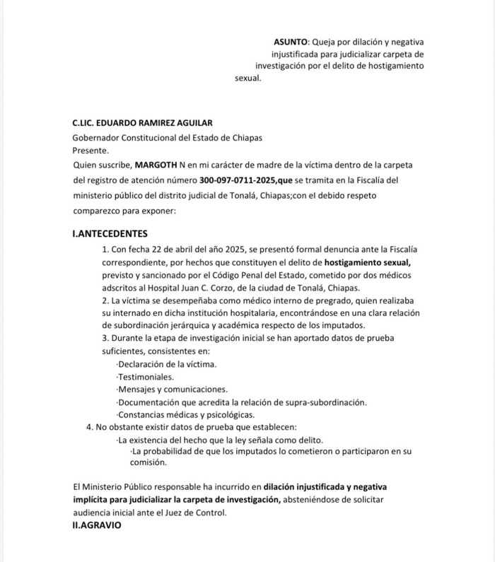 La madre de una médica interna de pregrado denunció presunta dilación e inacción por parte de la Fiscalía del Ministerio Público del distrito judicial de Tonalá en la integración de una carpeta de investigación por hostigamiento sexual contra dos médicos adscritos al Hospital Juan C. Corzo, en ese municipio costero.