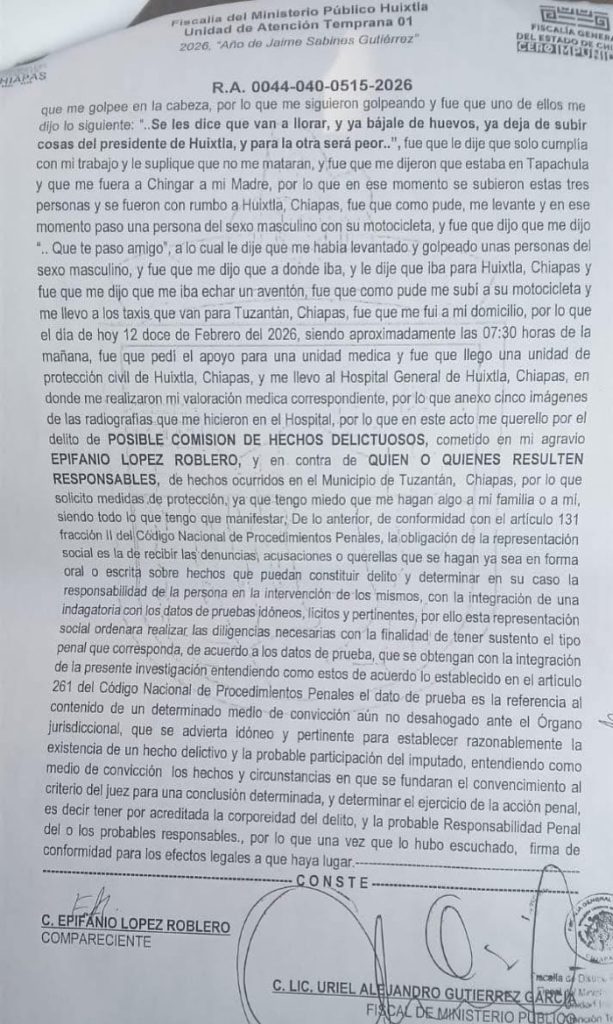 El periodista Epifanio López Roblero denunció ante la Fiscalía del Ministerio Público haber sido privado de su libertad y golpeado por sujetos desconocidos en el municipio de Tuzantán, hechos ocurridos la noche del 11 de febrero.