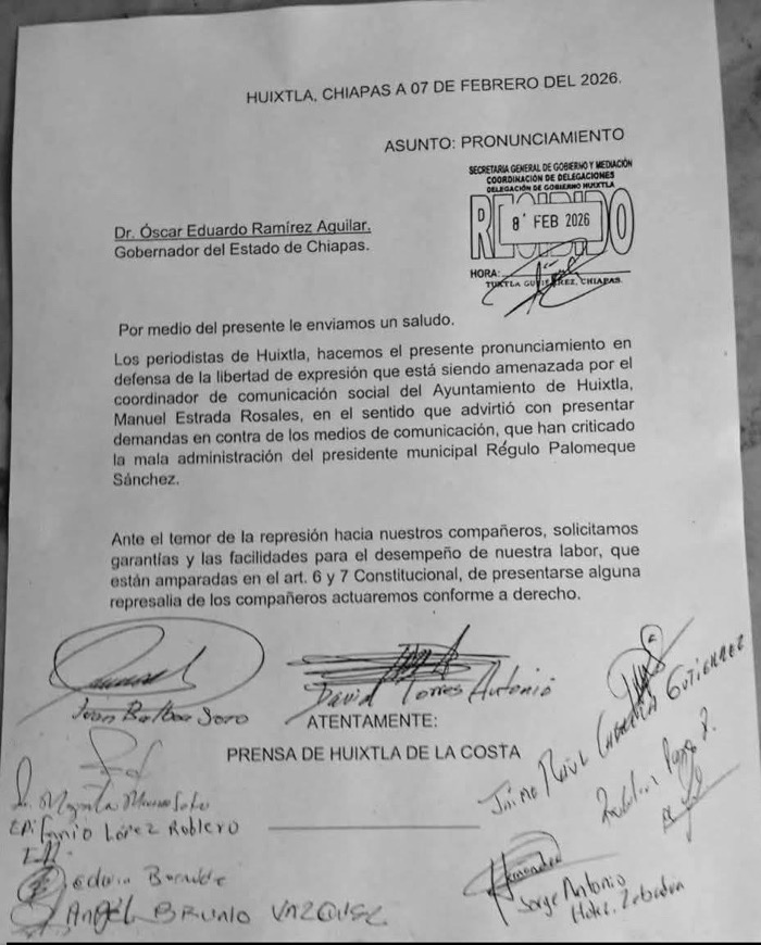 De acuerdo con el documento, fechado el 7 de febrero de 2026 y enviado a instancias estatales, los comunicadores señalaron que el coordinador de Comunicación Social del Ayuntamiento de Huixtla, Manuel Estrada Rosales, habría advertido sobre la posible presentación de demandas en contra de medios que han difundido críticas hacia la administración municipal encabezada por Régulo Palomeque Sánchez.