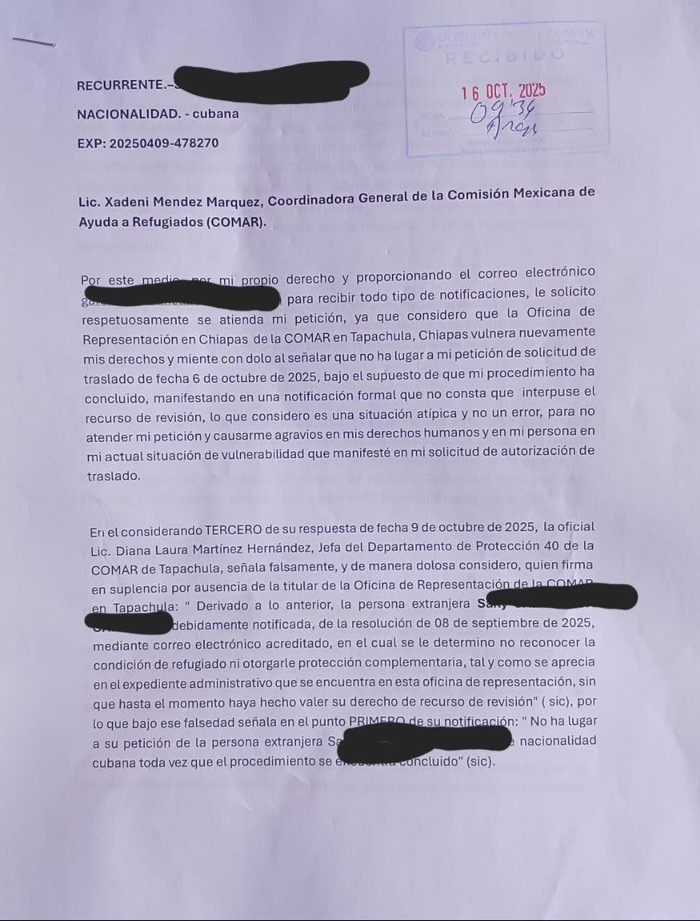 En su escrito dirigido a la coordinadora general de la COMAR, Xadeni Méndez Márquez, la migrante advirtió que la respuesta emitida por la Lic. Diana Laura Martínez Hernández, jefa del Departamento de Protección de la COMAR en Tapachula, incurre en falsedad al afirmar que “no consta en el expediente que haya interpuesto recurso de revisión” y que, por tanto, “no ha lugar a su petición de traslado”. La denunciante calificó esa declaración como “dolosa” y afirmó que le ha generado un impacto emocional y revictimización.