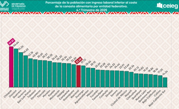 Seis de cada diez chiapanecos no pueden cubrir los gastos básicos del hogar con su ingreso, de acuerdo con datos del Instituto Nacional de Estadística y Geografía (INEGI), correspondientes al cuarto trimestre de 2025.