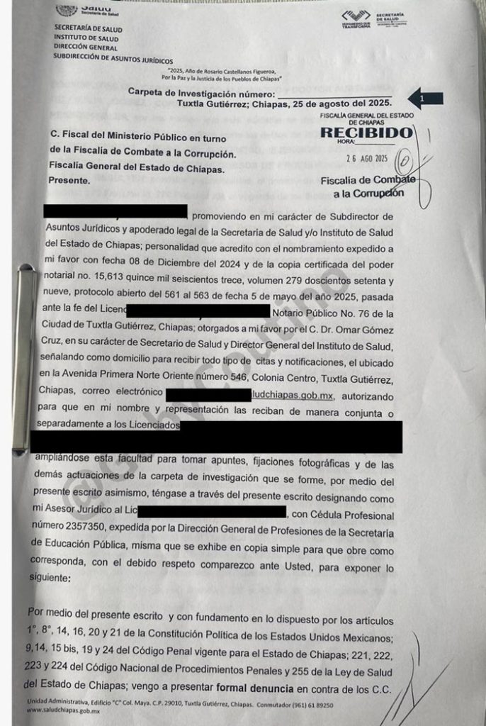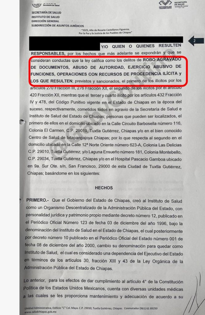 La Secretaría de Salud de Chiapas interpuso una denuncia penal ante la Fiscalía de Combate a la Corrupción en contra de exfuncionarios que laboraron durante la administración de José Manuel Cruz Castellanos, por presuntos delitos relacionados con el manejo de recursos públicos y documentos oficiales.