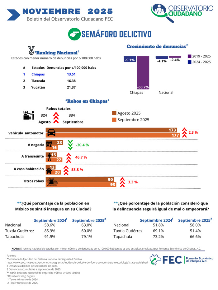 El Observatorio Ciudadano FEC reportó un aumento de 3.1 por ciento en los robos totales en Chiapas. En septiembre de 2025, los robos a casas habitación, negocios y transeúntes registraron incrementos de entre 46 por ciento y 54 por ciento. Pese a ello, el estado sigue teniendo la tasa más baja de denuncias del país, con 13.5 por cada 100 mil habitantes. Tlaxcala y Yucatán ocuparon la segunda y tercera posición, respectivamente.