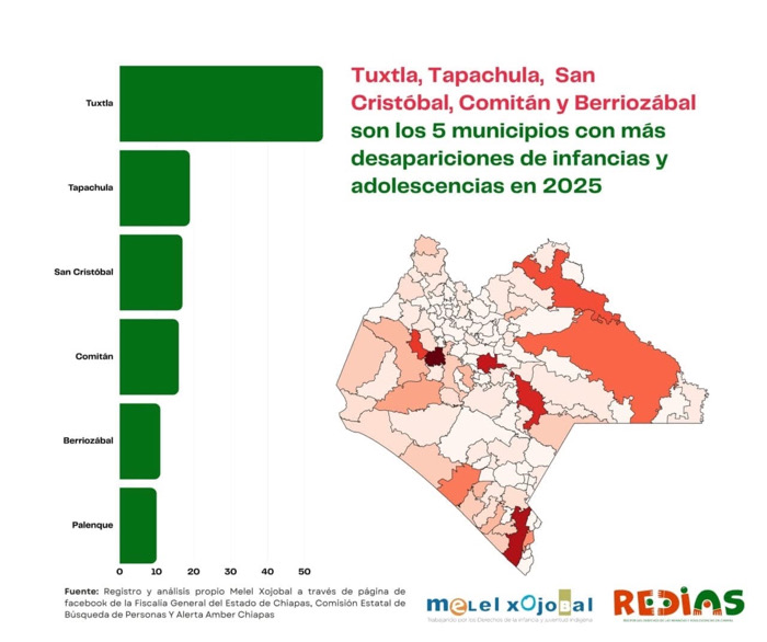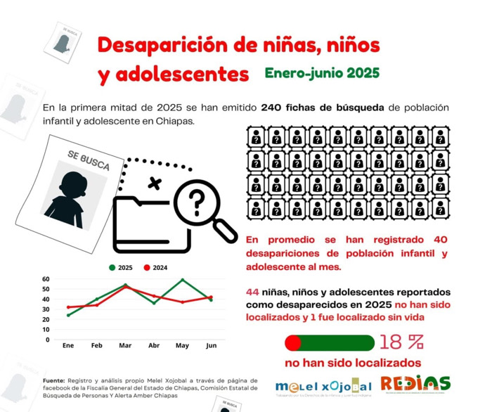 En la primera mitad de 2025 se registraron 240 fichas de búsqueda por desaparición de niñas, niños y adolescentes en Chiapas. El dato proviene del análisis de Melel Xojobal con base en publicaciones de la Fiscalía General del Estado, la Comisión Estatal de Búsqueda y Alerta Amber Chiapas (enero–junio de 2025).