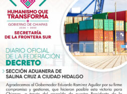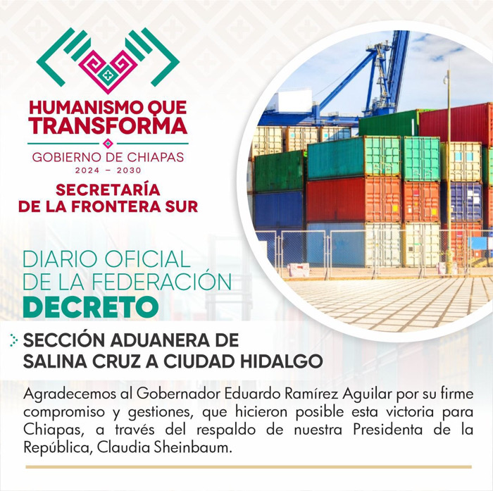 La Secretaría de la Frontera Sur, encabezada por María Amalia Toriello Elorza, celebra con gran satisfacción la publicación, este 15 de mayo de 2025 en el Diario Oficial de la Federación, del decreto que oficializa el retorno de la sección aduanera desde Salina Cruz, Oaxaca, a Ciudad Hidalgo, Chiapas.