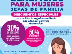 Del 8 al 31 de marzo, en el centro de cobro del Palacio Municipal, ubicado en 1.ª Oriente, entre 2.ª y 3.ª Norte, se ofrecerán descuentos especiales para facilitar la regularización de adeudos en el servicio doméstico.