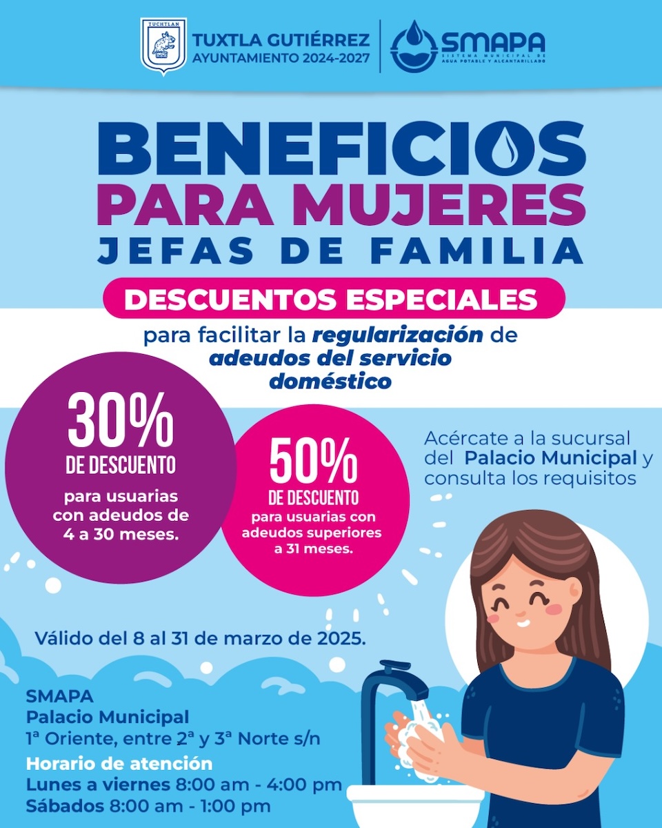 El Ayuntamiento de Tuxtla Gutiérrez, a través del Sistema Municipal de Agua Potable y Alcantarillado (SMAPA), se suma a la conmemoración del Día Internacional de la Mujer con la campaña “Beneficios para Mujeres Jefas de Familia”, reafirmando su compromiso con la justicia social y el acceso universal al agua potable y el apoyo a la economía de las mujeres.