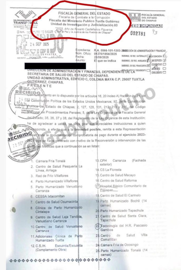 La Fiscalía Anticorrupción y la Unidad de Investigación y Judicialización de la Fiscalía General del Estado solicitaron a la Secretaría de Salud de Chiapas la entrega de documentación que compruebe los pagos relacionados con 105 unidades médicas intervenidas o reconvertidas en los ejercicios 2023 y 2024. El requerimiento forma parte del registro de atención R.A. 0566-101-1303-2025, en el que se pide información sobre los recursos empleados para dichas obras.