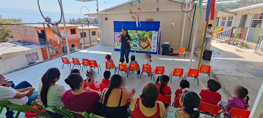 Estas acciones preventivas, también se hicieron presente en el jardín de niñas y niños, Juan Sabines Gutiérrez, a través del teatro guiñol con aventuras en la selva con el tema “Protege tu integridad” y “Padres de Éxito”, este último con la obra “Rescatando a la familia”.