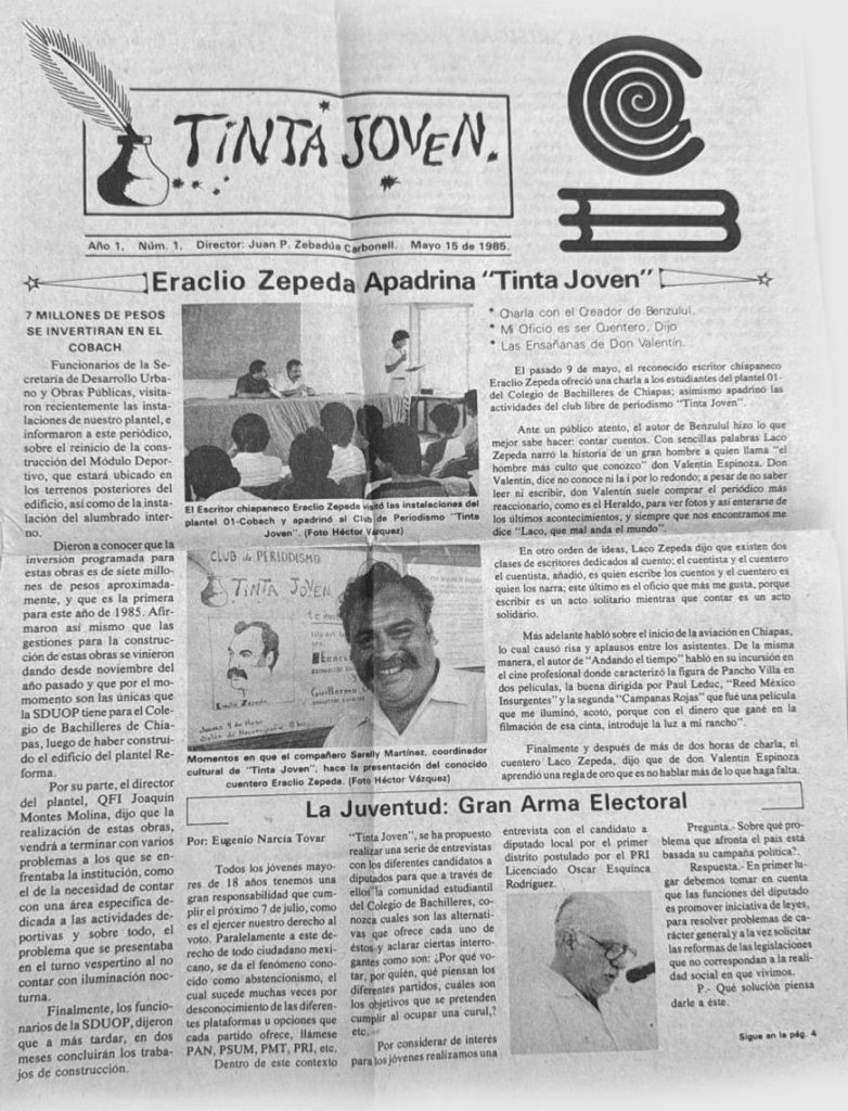 En 1985 un puñado de estudiantes del plantel 01 del Colegio de Bachilleres de Chiapas —ubicado en la entonces polvorienta delegación Terán de Tuxtla Gutiérrez— decidió fundar un “club libre de periodismo”. Le pusieron por nombre Tinta Joven, y aunque el arrebato juvenil solo alcanzó para la concreción de una publicación de dos ediciones —una en forma de periódico y otra como gaceta—, ese breve ejercicio marcó destinos. Aquel germen de vocación encontró aliento en la figura del escritor Eraclio Zepeda Ramos, quien generosamente aceptó apadrinar el proyecto. Lo que pretendía ser sólo una publicación estudiantil, resultó ser un semillero.